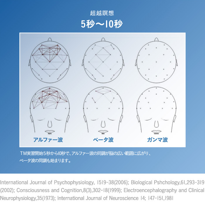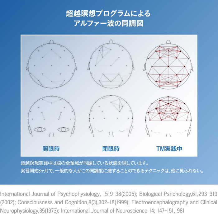 他のテクニックは脳機能においてまったく異なる効果を示します。たとえば、EEGの研究は、超越瞑想テクニックの実習時のみα波(8~12ヘルツ)が脳全体に現れます。α波は内なる静けさと、完全に目覚めた自己意識を伴う安らぎの機敏さで特徴づけられます。さらに超越瞑想の実習は前頭前野におけるEEGの同調が増します。前頭前野は脳におけるCEOと呼べるでしょう。