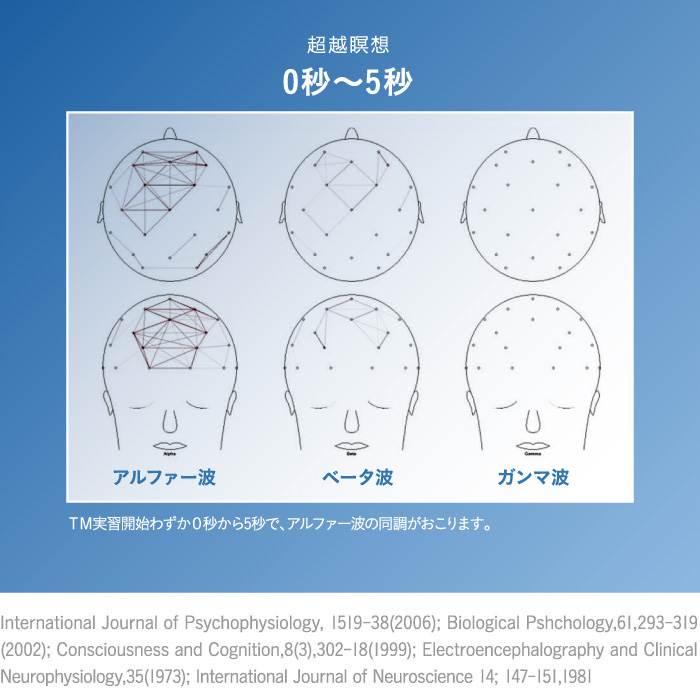 他のテクニックは脳機能においてまったく異なる効果を示します。たとえば、EEGの研究は、超越瞑想テクニックの実習時のみα波(8~12ヘルツ)が脳全体に現れます。α波は内なる静けさと、完全に目覚めた自己意識を伴う安らぎの機敏さで特徴づけられます。さらに超越瞑想の実習は前頭前野におけるEEGの同調が増します。前頭前野は脳におけるCEOと呼べるでしょう。