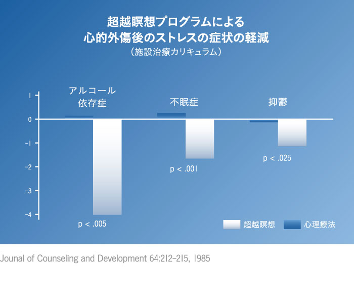 さらなる研究も、他の瞑想法は不安、鬱、不眠、および他のストレス症候群に対して超越瞑想とは異なる効果を示します。超越瞑想テクニックの効果は他とは異なることが、継続的な研究により立証されています